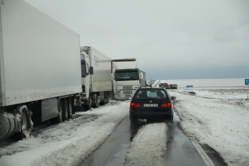 Грузовики стояли на обочине легковые потихоньку двигались на Астану. Была метель, но снега не много.
