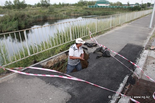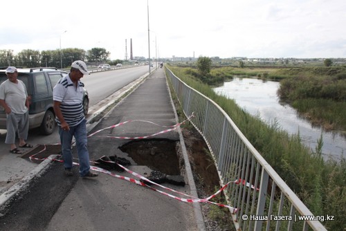 Дожди вновь размыли тротуар на дороге возле нового моста в Костанае