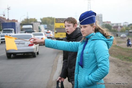 С первых дней учебного года на пешеходном переходе по ул. Каирбекова возле СШ № 4 в Костанае дежурят два преподавателя и два юных инспектора дорожного движения. Они помогают пройти пешеходам, извещая об этом водителей флажками.