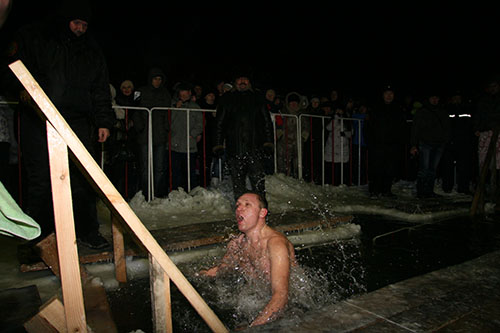 18 января, за 10-15 минут до полуночи, стоянка возле городского пляжа была заставлена автомобилями. Примерно по центру дороги, ведущей к пляжу, стоял дорожный полицейский и заворачивал машины налево - в сторону старого стадиона. Да и на нем нужно было сильно покрутиться, чтобы найти место. Оттуда толпы народа, увязая в сугробах и скользя по дороге, пробирались к проруби. Со стороны реки вереницей быстро шли и бежали люди - в халатах, замотанные в полотенца, в сланцах.