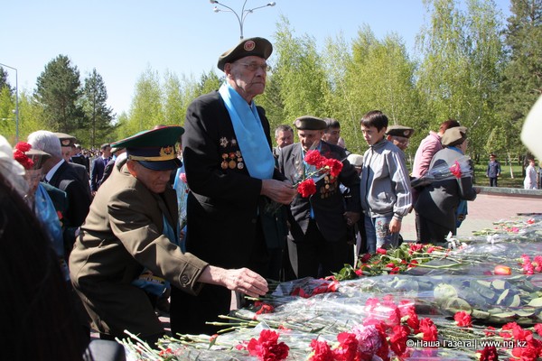 В этом году в Костанае, как и в остальных областных центрах Казахстана, не проводили военный парад. Но весь центр города 9 мая, в 10 часов утра, был заполнен людьми. Горожане целыми семьями пришли на праздник, чтобы в колонне пройти к памятнику в парке Победы и возложить цветы.