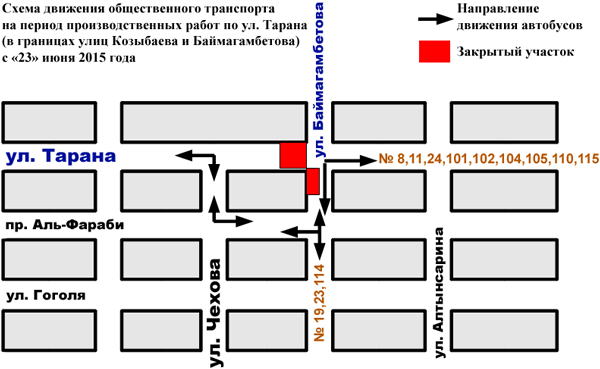 Автобусы № 8, 11, 24, 101, 102, 104, 105, 110 и 115, направляющиеся от железнодорожного вокзала, будут сворачивать на улицу Чехова, доезжать по пр. Аль-Фараби до ул. Баймагамбетова и по ней возвращаться на свой обычный маршрут по ул. Тарана.