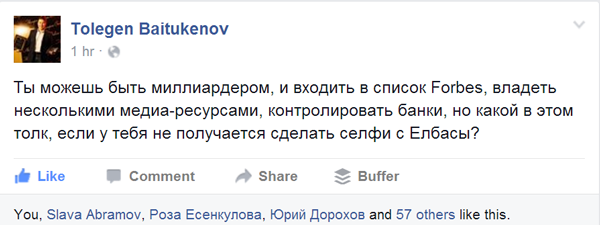 "Ты можешь быть миллиардером, и входить в список Forbes, владеть несколькими медиа-ресурсами, контролировать банки, но какой в этом толк, если у тебя не получается сделать селфи с Елбасы?" - пишет Толеген Байтукенов в Фейсбуке.