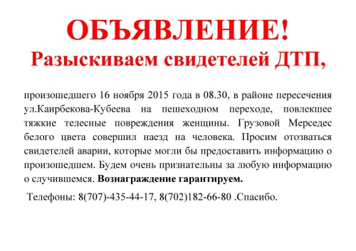 Грузовой Мерседес белого цвета совершил наезд на человека. Просим отозваться свидетелей аварии, которые могли бы предоставить информацию о произошедшем. Будем очень признательны за любую информацию о случившемся. Вознаграждение гарантируем. Телефоны: 8(707)-435-44-17, 8(702)182-66-80. Спасибо.