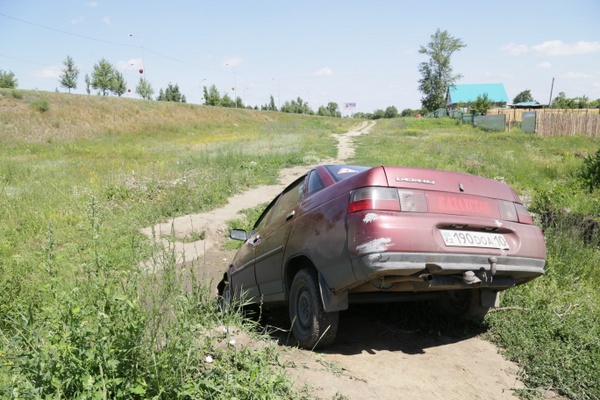 В логу возле ТЦ Астыкжан между дачами КЖБИ и проспектом абая вверх кормой стоит лада 2110. Видимо водитель перепутал пешеходную тропинку с дорогой и не заметил лог, скатившись в него не смог выехать и покинул машину. Но под одним колесом находится толстая доска, что наводит на мысль что он пошел на форсирование умышленно, поставил доску как мостик, но не расчитал крепость грунта, доска сошла с него.
