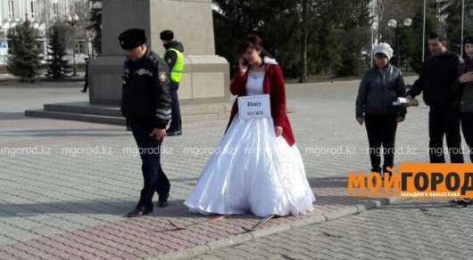 Уральске на площади Абая сотрудники полиции задержали девушку, которая вышла на улицу в свадебном платье, на лыжах и с табличкой на груди "Ищу мужа". Инцидент произошел утром в субботу 8 апреля сообщает "Мой ГОРОД".