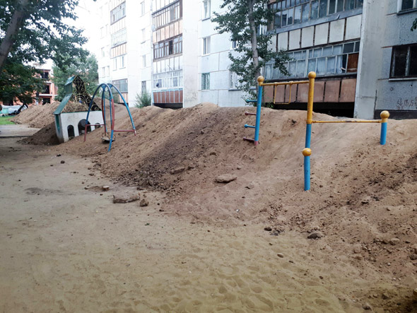 В нашем дворе по пр. Кобланды батыра, 26 прокопали траншею под трубы и завалили землей всю детскую площадку. Ничего не ограждено, целыми днями дети играют на этой куче, а с обратной стороны глубокий ров. Это опасно и вся детская площадка засыпана напрочь!