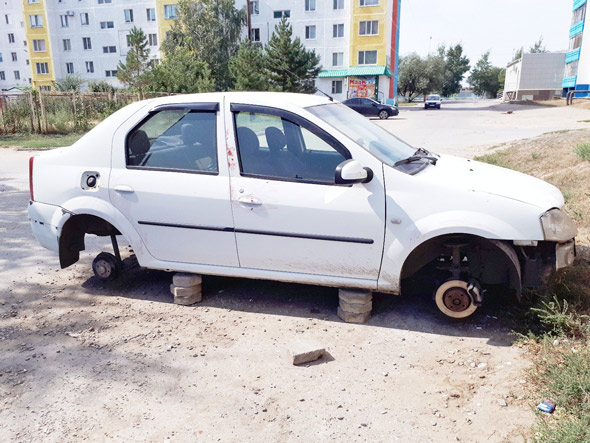 На стоянке около домов по ул. Карбышева, 53 и 49 у автомобиля сняли все 4 колеса. Хозяин автомобиля обнаружил это только сегодня, 30 августа, хотя по словам местных жителей еще вчера машина стояла в таком виде. Сегодня на месте работала следственно-оперативная группа, по словам сотрудников полиции на их практике это в первые и подобного в Костанае уже давно не было.