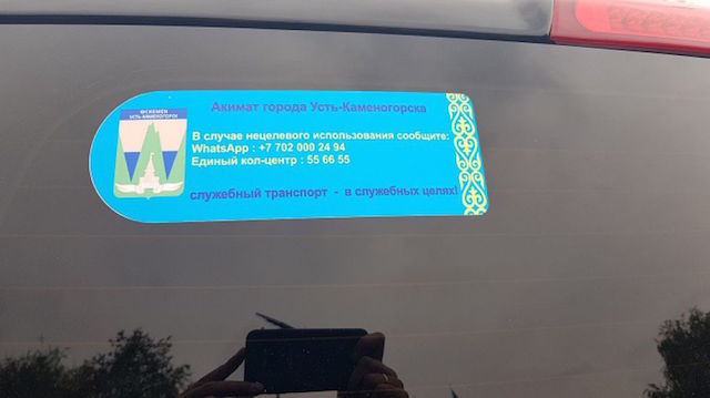 Затем участники акции разделились, и каждый поместил наклейку на заднее стекло служебного авто. Процесс подкреплялся видеосъёмкой. Сами стикеры выдержаны в нейтральных цветах и особого внимания не привлекают. Они содержат текст следующего содержания «Служебный транспорт – в служебных целях! Акимат Усть-Каменогорска. В случае нецелевого использования сообщите...», далее указаны соответствующие единые номера.