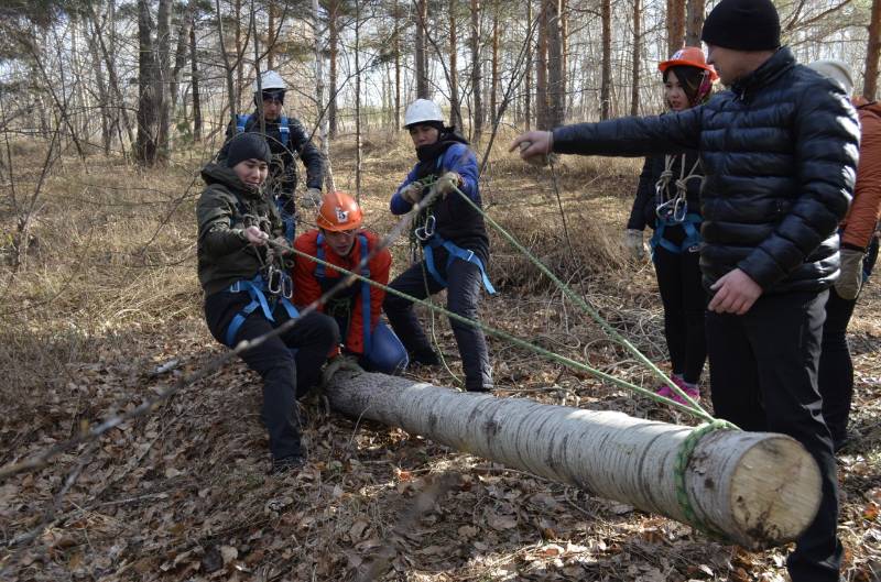 На практике подготовлены 5 этапов: подъем по жумару, переправа по бревну с самонаведением, навесная переправа, вязка носилок и способы транспортировки условно пострадавшего, переправа по жердям, вязка узлов.
