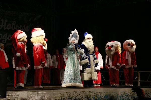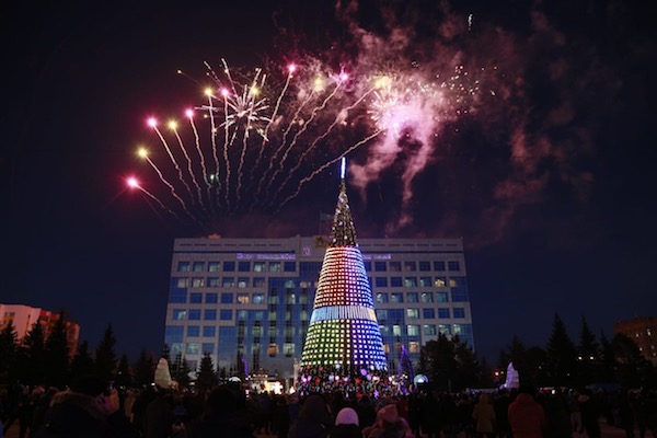 Он рассказал об успехах уходящего года и поздравил костанайцев с наступающим праздником. После чего Дед Мороз и Снегурочка зажгли огни на елке.