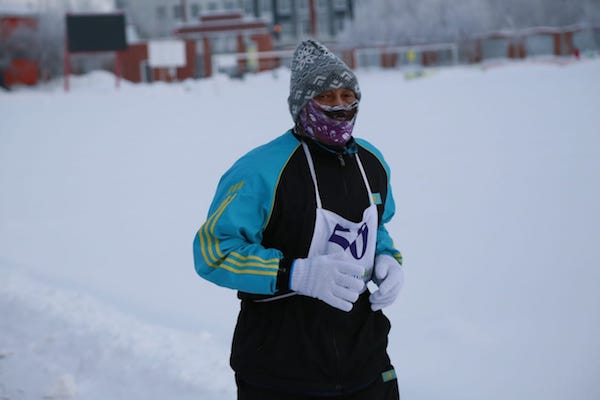Замерзшая, но довольная бежала и молодёжь. Младшие - 3 круга, взрослые - 6.
