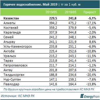 Самые высокие тарифы на горячую воду среди городов - в Алматы: 394,2 тенге за кубометр, что, в то же время, на 17,1% меньше, чем в мае прошлого года. На втором и третьем месте Костанай (359,2 тенге, –5,4%) и Караганда (337,9 тенге, –2%).