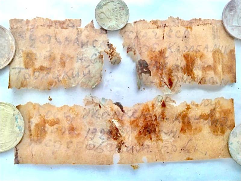 Михаил и Сергей Бобылев работали в районе деревни Малое Карпово. В раскопе они обнаружили две гильзы. Вид у них был очень плачевный, казалось, что без шансов. Но видимо кто-то очень ждет этих бойцов и им надо вернуться, потому что две записки были прочтены и имена установлены. Один из солдат оказался из Якутской АССР, это Габышев Александр, а второй боец из Казахстана, Кустанайской области, Жаркенов Кананья, 1923 года.