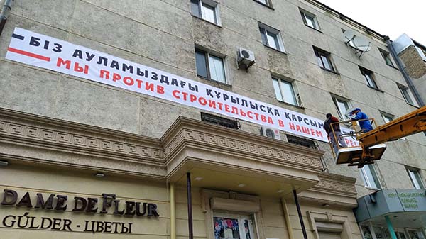 Баннер с надписью «Мы против строительства в нашем дворе!» вывесили 12 августа на стене дома № 183 по ул. Баймагамбетова. Жильцы таким образом пытались остановить возведение 9-этажного здания общежития медицинского училища. Но приехали сотрудники горакимата, после чего баннер был снят.