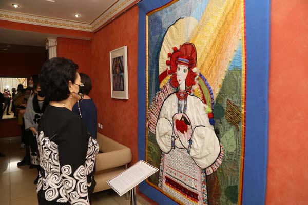 Выставку Ольги Дитте разместили недалеко от гардероба, ее организовали при поддержке Русского дома в Нур-Султане. Тема: «Женщина и женское восприятие мира в цветах». Всего 6 картин, написанных в марте этого года. По задумке автора, они соединяют в себе славянские и казахские мотивы. А сама художница близка к сцене, так как создавала костюмы для житомирского театра. Работы выполнены с помощью лоскутов ткани или рисованы красками.