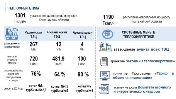 - Дефицита выработки тепловой энергии в регионе нет, - заверил вице-министр. - В Костанайской области источниками тепловой энергии являются Рудненская, Костанайская и Аркалыкская ТЭЦ. Установленная тепловая мощность трех ТЭЦ составляет 1 301 Гкал/ч, располагаемая тепловая мощность - 1 190 Гкал/ч.