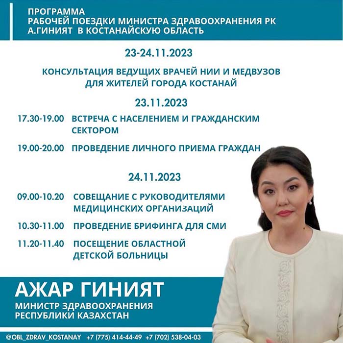 После, в 19:00, в графике министра запланирован личный прием. Записаться на него можно по номерам 8 (775) 414-44-49, 8 (702) 538-04-03. Но сделать это можно только до 11:00.