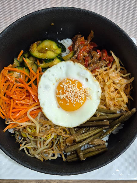 Оказалось, что более аутентичный вариант - на кисло-сладкой воде. Мы проголосовали за традиции. Из этих же соображений взяли суп. Ну а я - тот самый пибим паб, который должен был включать промаринованное обжаренное мясо, много разных овощей, свежих и ферментированных, рис, а также жареное яйцо.