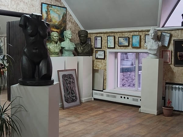 В мастерской привлекает внимание бюст костанайского фотографа Георгия Шаповалова. При ближайшем рассмотрении обнаруживается советский фотоаппарат-гармошка, а в волосах искусно вплетена фотопленка. На каждом кадре запечатлены моменты профессиональной деятельности. Это не просто скульптура, а рассказ о жизни.