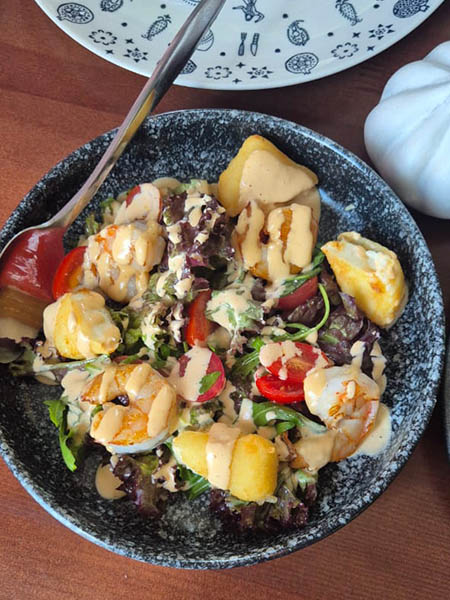 Сикварули с грузинского «любовь». Как мы поняли, это местный фирменный салат. В нем зелень, крупные креветки, помидоры-черри, жаренный в панировке сулугуни, соус с остринкой. В меню, кстати, значится просьба: если у вас аллергия на что-нибудь, предупредите официанта. Просьба уместная, в блюдах немало специй. Но верьте слову - ничего слишком. По крайней мере, в тех блюдах, которые мы брали.