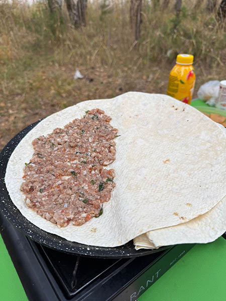 - Мы взяли с собой упаковку круглого лаваша (в одной - 4 штуки) и подготовленный фарш, - написал Ночной Дозор. - Фарш у нас смешанный, традиционно такой используем для чебуреков. Заправили для сочности мы его так: в блендере смешали большую помидорину, лук, чесночок. И эту массу добавили в 250 г фарша. Потом еще нарезанную зелень.