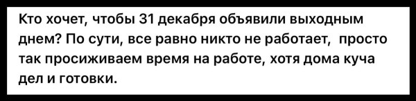 - Кто хочет, чтобы 31 декабря объявили выходным днем? По сути, все равно никто не работает, просто так просиживаем время на работе, хотя дома куча дел и готовки, - спросил автор.
