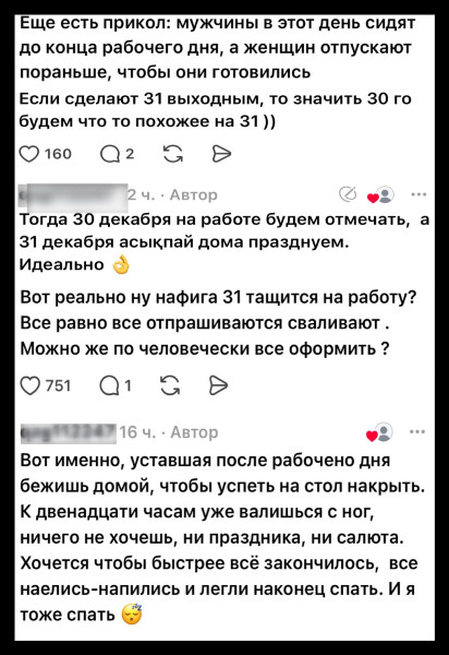 В социальных сетях снова разгорелась дискуссия о том, стоит ли объявить 31 декабря официальным выходным днем, передаёт Tengri Life.
