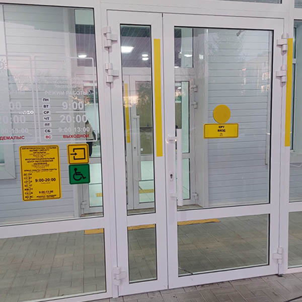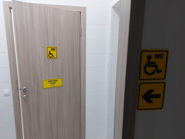 Проложены тактильные дорожки, установлены настенные указатели со шрифтом Брайля, оборудованы низкие стойки для обслуживания маломобильных посетителей.