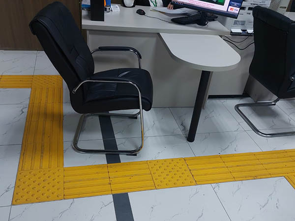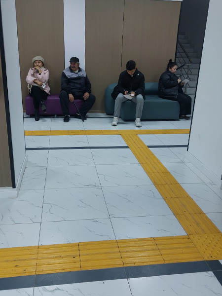 Напольные тактильные линии теперь ведут не только в туалет и обратно, как раньше. Есть ответвления к стойке регистратуры и к отдельным социальным окнам для лиц с инвалидностью и других льготников