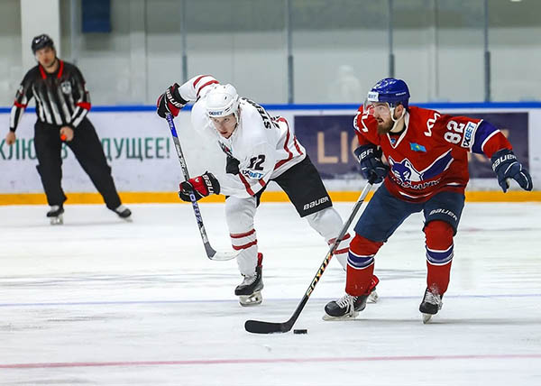 Нападающий «Горняка» Евгений Степанов преследует защитника «Арлана» Александра Гопиенко / Фото instagram.com/hcarlan_official