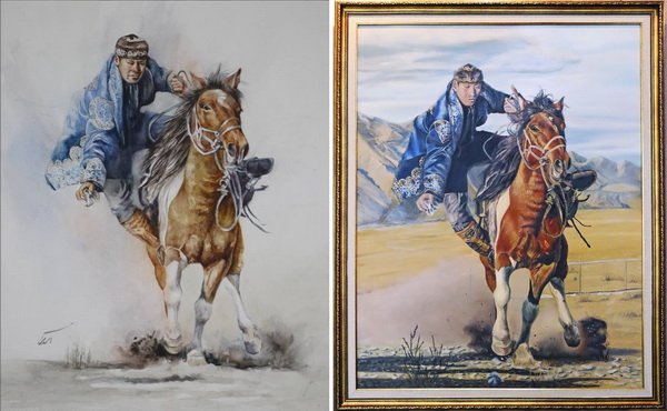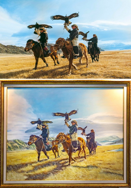 В оригинале это монгольские беркутчи из Китая. В копии, выданной на конкурсе за авторскую работу, они превратились в казахов. Даже пейзаж слизан один в один.
