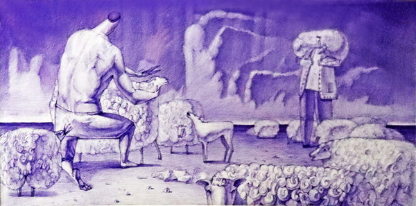 Первой же в графической номинации жюри признало работу шариковой ручкой «Стрижка овец» кокшетауца Дамира Магзумова. Его графика – эпатажный корпоративно-животноводческий мемфис с элементами абсурда, среди мейнстримных работ смотрится чужеродно, зато нетрафаретно.