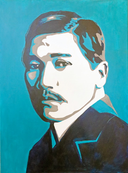 Автор упомянутого, одного из трёх представленных на вернисаже портретов Миржакыпа Дулатова – Мадина Умиртаева. Её public art - очевидная отсылка к Шепарду Фейри с постерной стилизацией и идеализацией.