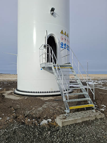 На станции Марс-Юпитер высота ветряков - 115 м, диаметр ветроколеса - 180 м. Выработка энергии начинается при скорости ветра 3 м/сек, при 25 м/сек автоматически отключается. По словам сотрудников компании, везти такую штуку приходится на четырех фурах, но собирать на месте несложно. Говорят, при хорошей погоде хватает трех дней. Все оборудование произведено в Китае, кран, который поднимает ветрогенератор при установке, - тоже.