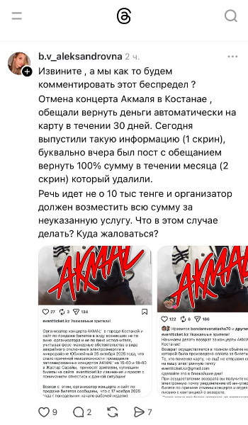 - Извините, а мы как то будем комментировать этот беспредел?! Обещали вернуть деньги автоматически на карту в течении 30 дней. Буквально вчера был пост с обещанием вернуть 100% сумму в течение месяца, который удалили, - пишет подписчица Treads b.v_aleksandrovna. - Речь идет не о 10 тыс тенге, и организатор должен возместить всю сумму за неуказанную услугу. Что в этом случае делать? Куда жаловаться?