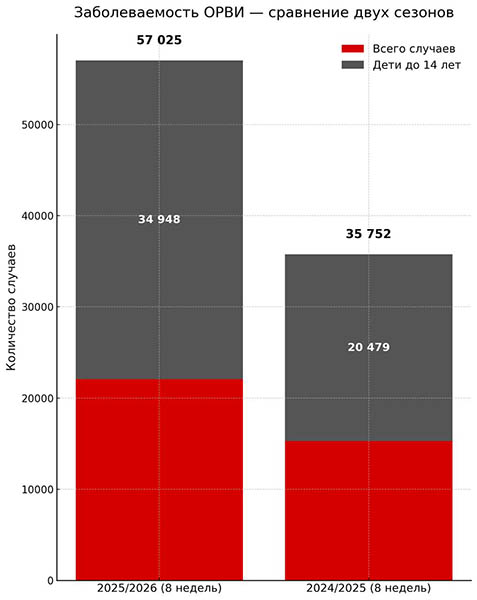 Всего за 8 недель (недели 40-47) сезона 2025/2026 года зарегистрировано 57 025 случаев ОРВИ, заболеваемость составила 6 862,1. Детей до 14 лет – 34 948 случаев.