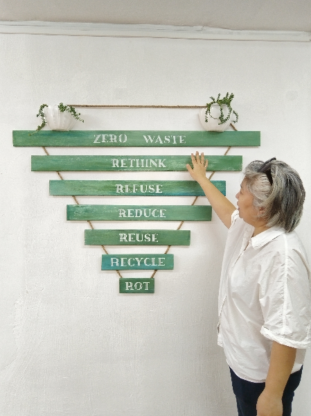 Смысл экологической площадки – теория и практика. С наполнением и развитием помогают студенты и преподаватели КИнЭУ. Основной принцип иллюстрирует экспозиция «Ноль отходов»: переосмысли, откажись, сократи, используй повторно, переработай и компостируй.