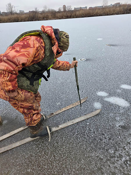 Мы с Сабанеем выходим на лед, когда он достигает 15-20 см, передвигаемся на расстоянии друг от друга и обходим места возможных промоин (они более темного цвета). И, конечно, обходим стороной течение на реках. Обязательны при первых зимних рыбалках у нас спасательные жилеты и пешня, которой Сабаней проверяет лед впереди себя. Я иду сзади и всегда на всякий случай с длинной веревкой. Но бывает, что прочность и безопасность льда Сабаней проверяет с помощью лыж. Так было и недавним днем на тобольской старице.