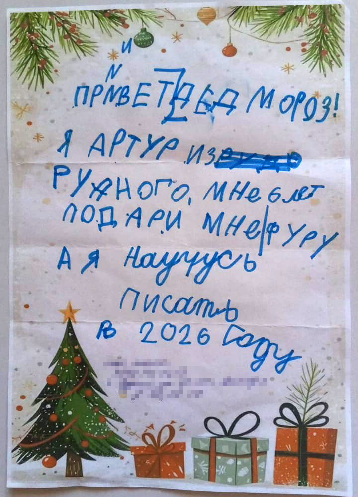 Письма бывают разные: сухие, трогательные, серьезные, а есть забавные. И пусть написаны они без особых изысков, но обязательно вызывают улыбку. Такое письмо прислал Деду Морозу 6-летний Артур. Он очень хочет машинку, да не какую-нибудь легкомысленную гоночную, а суровую фуру. А чтобы новогодний волшебник не оставил без внимания эту заявку на подарок, мальчик пообещал кое-что взамен. Читайте сами.