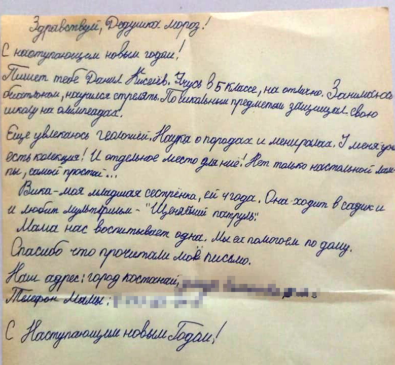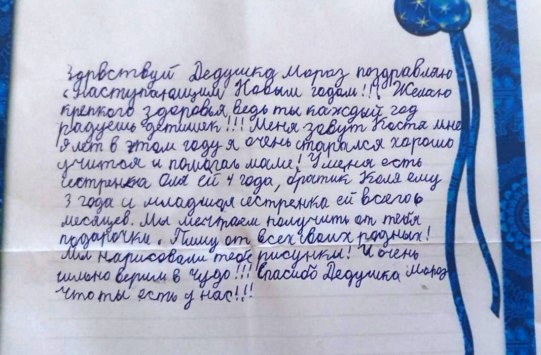 9-летний костанаец Костя - мамин помощник, старательный ученик и хороший брат. В самом начале письма он от всей души пожелал Деду Морозу крепкого здоровья - видно, что родители воспитывают вежливого человека. У Кости есть брат - 3-летний Коля и сестренка - 4-летняя Оля. Он, конечно же, хочет, чтобы Дед Мороз принес подарки всем троим. Но какие подарки, не уточняет. Однако в качестве намека к письму приложены два рисунка (к сожалению, из-за бледности изображения сканировать их - занятие неблагодарное). На одном - игрушечный автомат (видимо, о нем мечтает сам Костя), а на другом - мягкие игрушки.