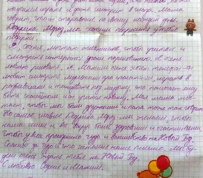 Не первый год приходят письма из семьи, в которой есть трое детей: Егор, Ульяна и Артем. Ульяне 9 лет, она очень любит рисовать и всегда украшает письма замечательными рисунками. 8-летний Егор - отличник и большой любитель конструкторов. Артем - самый старший из троих детей, но он не может разговаривать. Вот как пишет о своих братьях Ульяна.