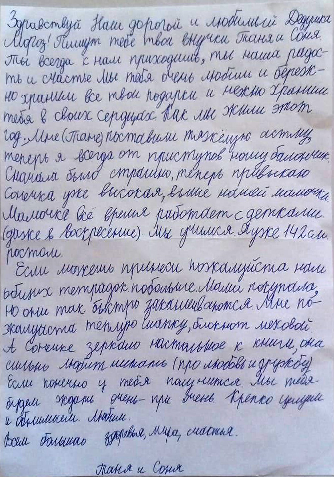 Желания Тани и Сони довольно скромные: побольше общих тетрадей, книги, теплую шапку, настольное зеркало