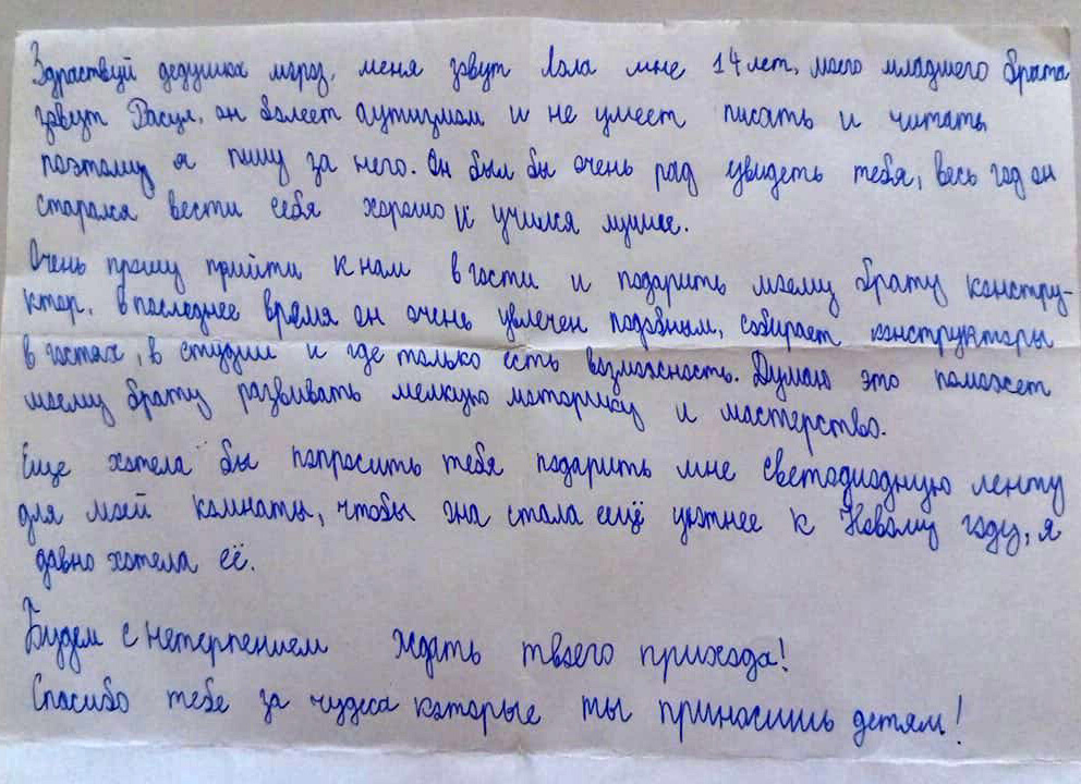И еще одна история с аутизмом. Такой диагноз стоит у Расула, младшего брата Лолы, написавшей письмо. Лоле 14 лет, подростковый возраст... Время природного эгоизма, когда больше думают о себе, такой уж период в жизни. Но Лола просит конструктор для Расула, чтобы он лучше мог развивать мелкую моторику. А для себя совсем скромный подарок - светодиодную ленту. Девочка хочет украсить свою комнату к Новому году, чтобы было уютно и красиво.