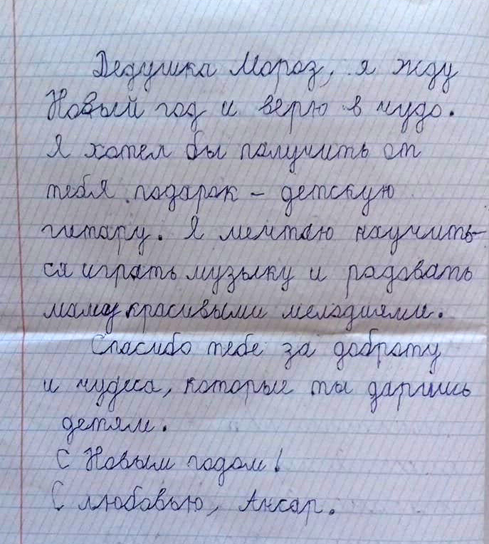 У 7-летнего Ансара прекрасный почерк, видно, что он - старательный ученик. А еще, как написал сам мальчик, он не только хорошо учится в 1-м классе, но и хорошо себя ведет и в школе, и дома. Мама у него одна, и он помогает ей во всем в меру своих детских сил. Разве такой примерный ребенок не заслужил подарок?