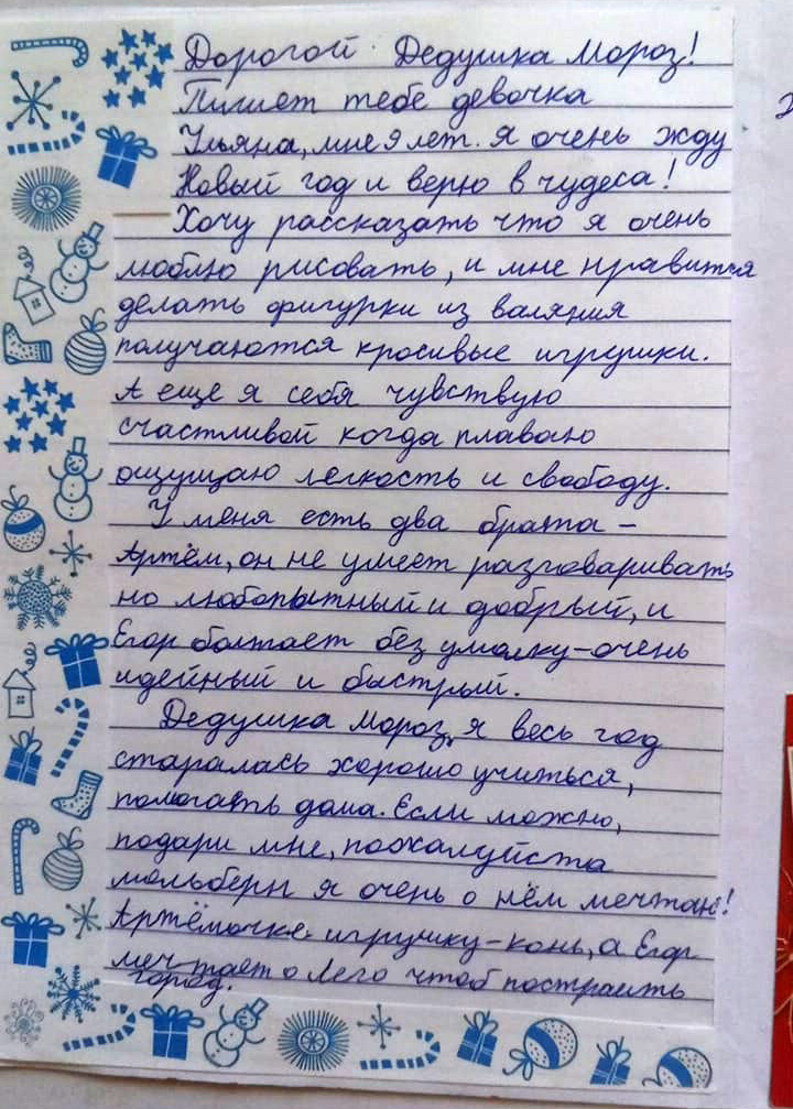 - Знаешь, Дедушка Мороз, иногда мне кажется, что чудеса случаются, когда их очень ждешь и в них по-настоящему веришь, - раскрывает свою мечту Оля. - У меня есть большая мечта, я очень хочу велосипед. Я представляю, как мы с мамой выходим во двор и я учусь кататься, мама улыбается, а я чувствую себя самой счастливой на свете. Я бы каталась аккуратно, берегла его и никогда не ломала. Этот велосипед стал бы для меня настоящим чудом. Если ты сможешь исполнить мою мечту, я буду благодарна всем сердцем. А если нет, я все равно буду верить в добро и волшебство.