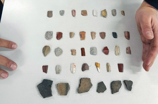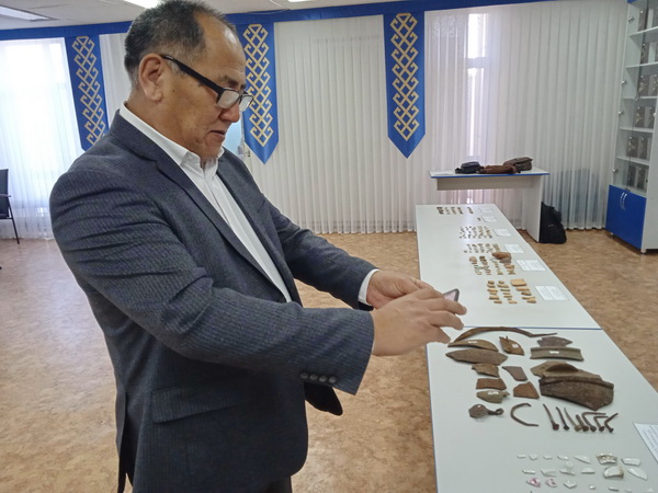 - Вот смотрите: верхний ряд – это то, что обнаружено возле геоглифа «Линия Сандыктау», - поясняет специалист отдела археологических исследований и первооткрыватель геоглифов Дмитрий Дей. - А второй и следующие ряды – с уштогайской группы из трёх геоглифов, возле старого русла реки. Всего там было обнаружено в двух шурфах 885 артефактов! Здесь представлены, понятно, не все. И что мы видим? Каменные пластины – явно неолит, а на керамике – следы от шерсти. Так выглядела только маханджарская керамика.
