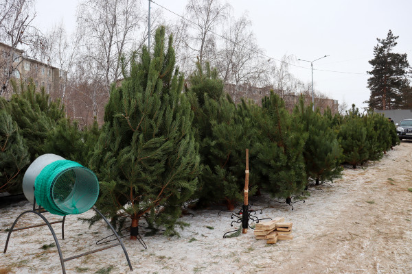 Деревья привозят из Челябинска. В продаже есть сосны высотой от 1,5 м до 2,7 м, ели - до 2,5 метра. Цена - от 5 000 до 13 000 тенге в зависимости от размера. Есть пихтовые ветки, которые чаще используют в качестве банного веника, по 1 500 тенге за штуку.