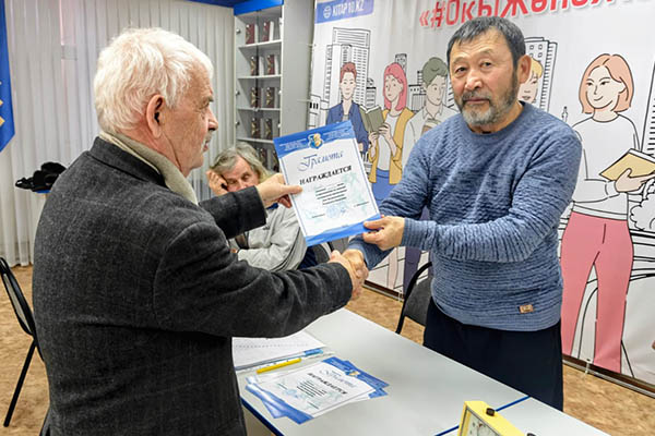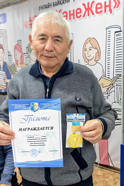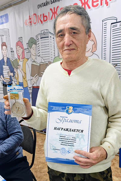 Судья соревнований Юрий Бондаренко вручает грамоту Жалгасбеку Спанову