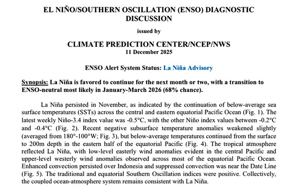 - По данным NOAA, - сообщает Кирилл, - в этом декабре продолжается эффект Ла-Нинья, и на основе этого NOAA делает краткий прогноз о последствиях для климата, сельского хозяйства и воды, в том числе и для севера Казахстана. Поясню для неспециалистов, что Ла-Нинья - это крупномасштабное климатическое явление в Тихом океане, противоположное Эль-Ниньо. Это похолодание поверхностных вод в экваториальной части, которое влияет на погоду по всему миру. Из-за него усиливаются дожди в одних регионах (например, в Австралии и Азии) и, наоборот, происходят засухи в других, а заодно меняется циркуляция атмосферы. Этот цикл происходит примерно раз в 3-7 лет и может длиться от нескольких месяцев до года-полутора. У NOAA накоплены данные наблюдений суммарно более чем за сто лет.